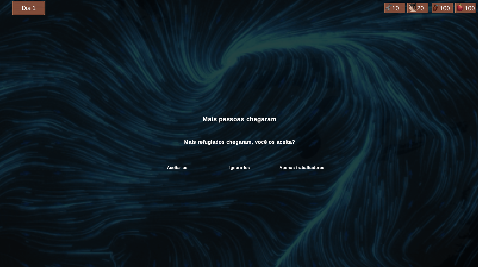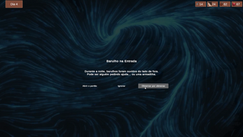 "Rain Outside" é um jogo simples de texto e escolhas, onde você deve gerenciar um abrigo que passa por situações dificeis diariamente.